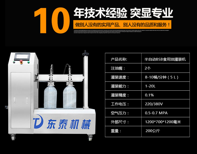 本機適用于花生油、大豆油、菜籽油、色拉油、芝麻油、石油化工潤滑油等各種油類和粘稠液體的定量要求。半自動雙頭電動BSB食用油灌裝機:采用先進的微電腦技術(shù),自備動力,管路無需加壓,節(jié)約運行成本;自動檢測油浙、自動修正溫度變化引起的密度變化,適合大溫差環(huán)境的油品灌裝工作,使用方便靈活;機電一體化設(shè)計,安裝方便,整機價格低廉。