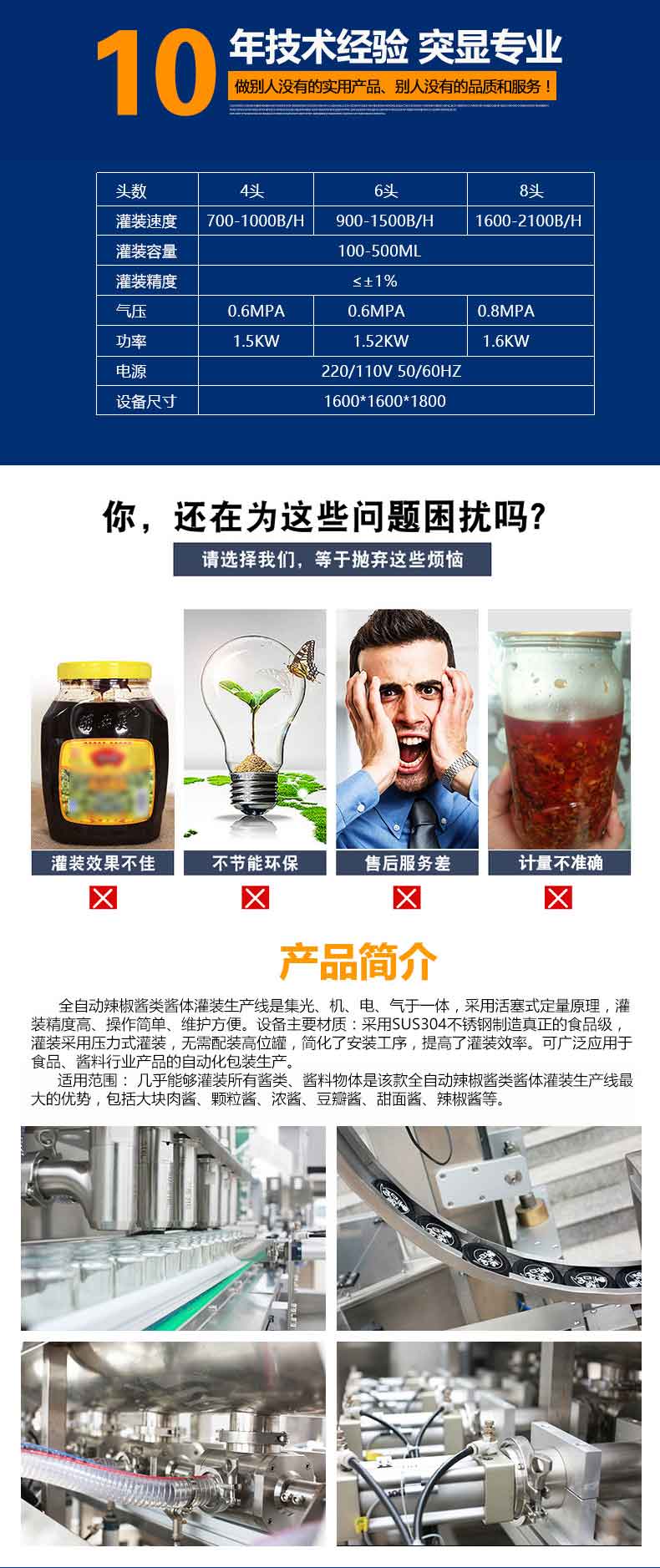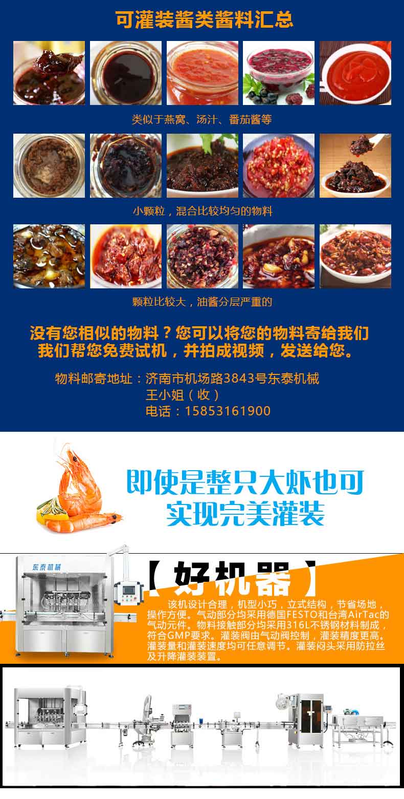 幾乎能夠灌裝所有醬類、醬料物體是該款全自動辣椒醬類醬體灌裝生產(chǎn)線最大的優(yōu)勢,包括大塊肉醬、顆粒醬、濃醬、豆瓣醬、甜面醬、辣椒醬等。