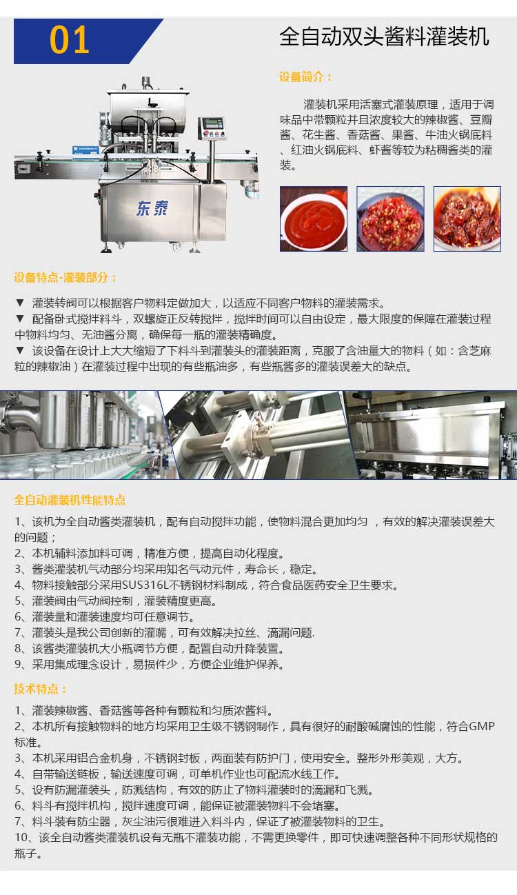 1、該機為全自動醬類灌裝機,配有自動攪拌功能,使物料混合更加均勻 ,有效的解決灌裝誤差大的問題;