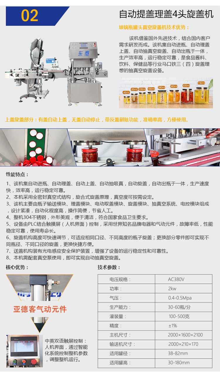 該機借鑒國外先進技術(shù),結(jié)合國內(nèi)客戶需求研發(fā)而成。該機集自動進瓶、自動理蓋上蓋、自動抽真空旋蓋、自動出瓶于一體,生產(chǎn)效率高,運行穩(wěn)定可靠,是食品醬料、飲料、保健品等行業(yè)馬口鐵三(四)旋蓋理想的抽真空旋蓋設(shè)備。