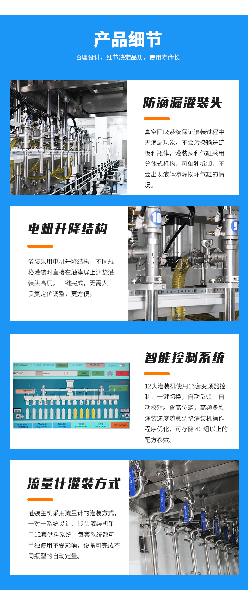 泡等);灌裝頭整體上升方式平穩(wěn),不產(chǎn)生震動,高度及寬度可調(diào);