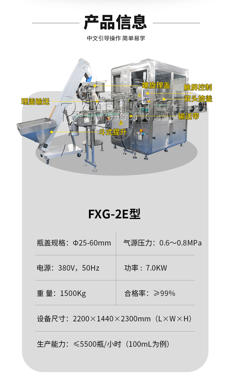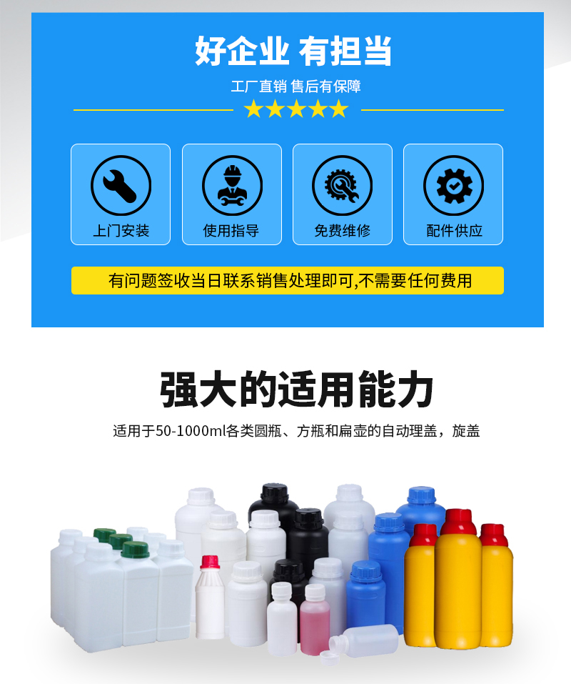 1、通用性強:適用于50-1000ml各類圓瓶、方瓶和扁壺的自動理蓋,旋蓋;