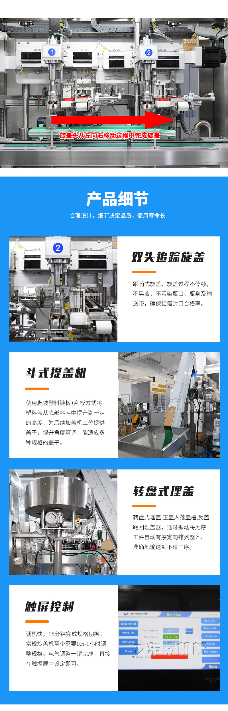 3、切換規(guī)格簡單、維護(hù)成本低:只需更換不同規(guī)格的旋蓋頭即可,10分鐘完成快速切換;所有易損件一目了然;