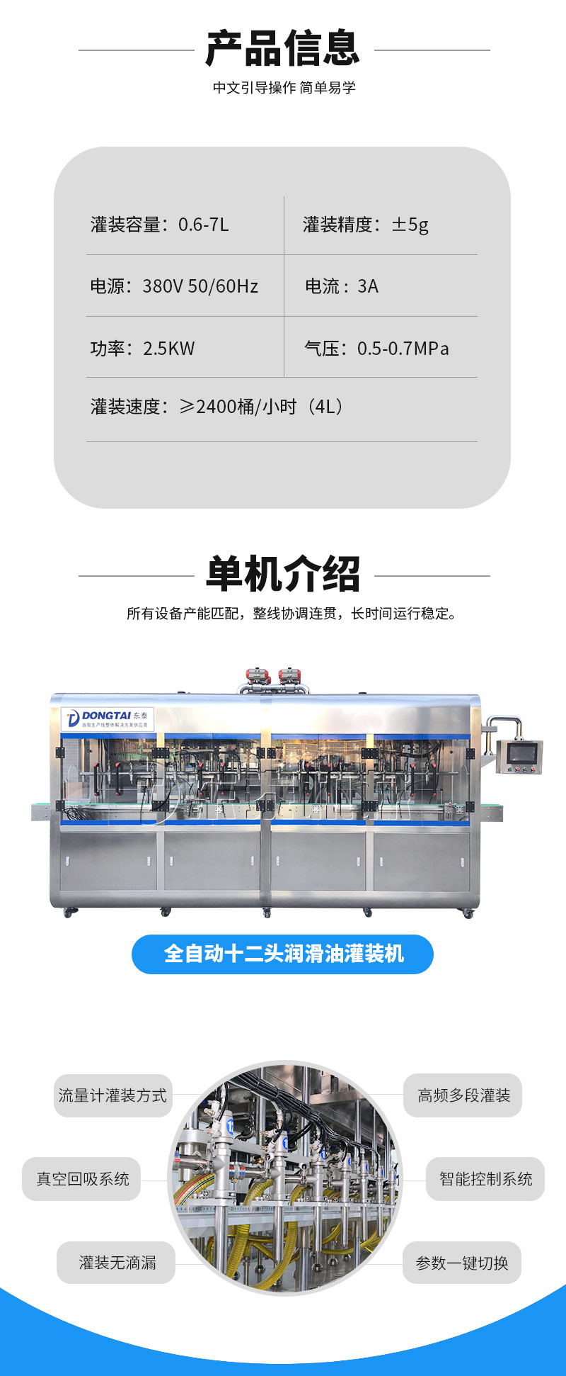 1.灌裝主機采用流量計的灌裝方式,一對一專利系統(tǒng)設(shè)計,12頭灌裝機采用12套供料系統(tǒng),每套系統(tǒng)都可單獨使用不受影響,設(shè)備可完成不同瓶型的自動定量;
