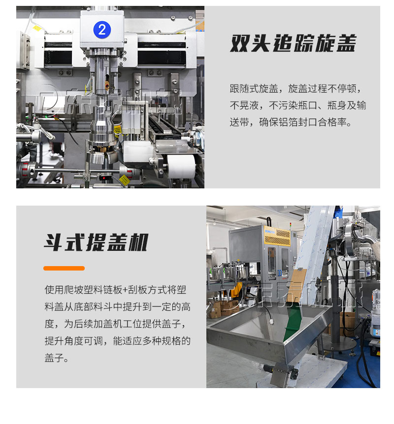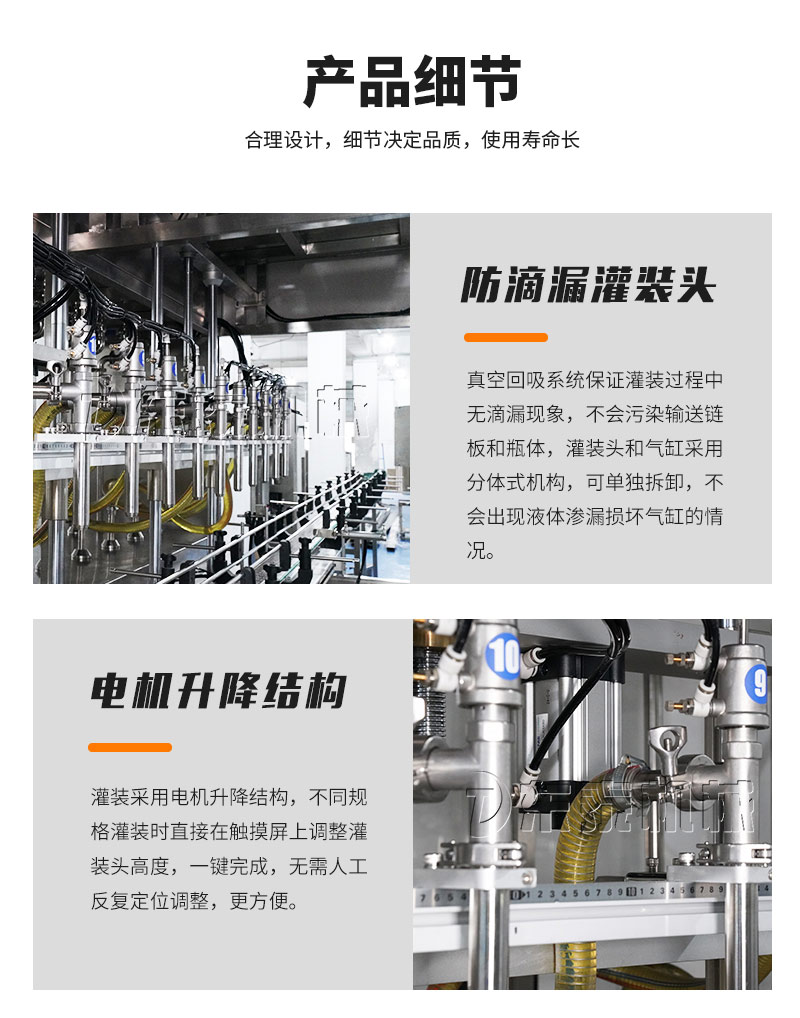 2.灌裝采用電機升降結(jié)構(gòu),不同規(guī)格灌裝時直接在觸摸屏上調(diào)整灌裝頭高度,一鍵完成,無需人工反復(fù)定位調(diào)整,更方便。
