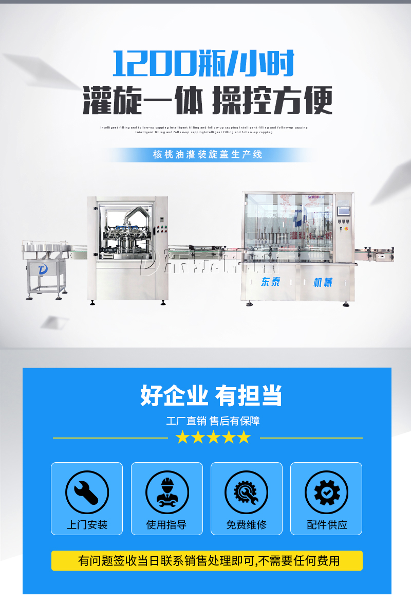 全自動核桃油灌裝流水線設(shè)備具有穩(wěn)定可靠、自動化水平高,相比同類產(chǎn)品有著更長的使用年限,維護(hù)簡單,整線中各設(shè)備的協(xié)調(diào)性、連貫性強(qiáng),整線設(shè)計合理等特點。灌裝設(shè)備采用獨家專利系統(tǒng)結(jié)構(gòu),為當(dāng)今行業(yè)內(nèi)領(lǐng)先水平,整線滿足量產(chǎn)化、集成化生產(chǎn)的需要。
