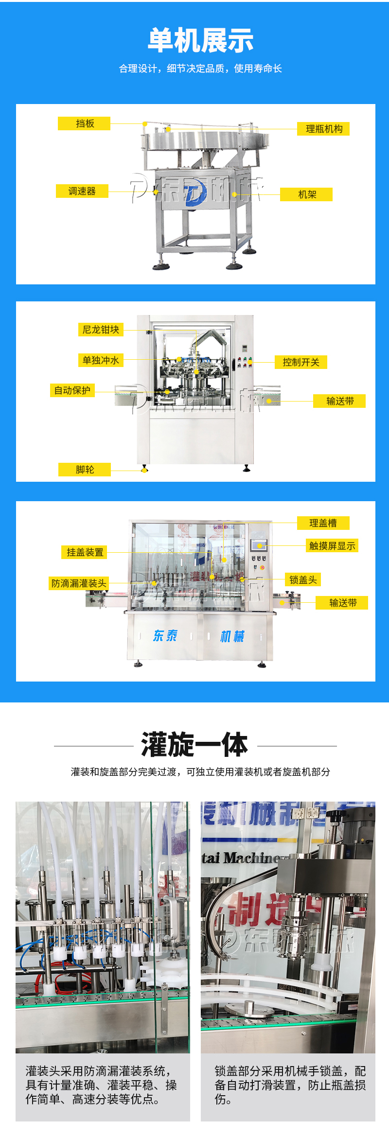 1、本灌裝旋蓋機(jī)采用機(jī)械手旋蓋,配備自動打滑裝置,防止瓶蓋損傷。