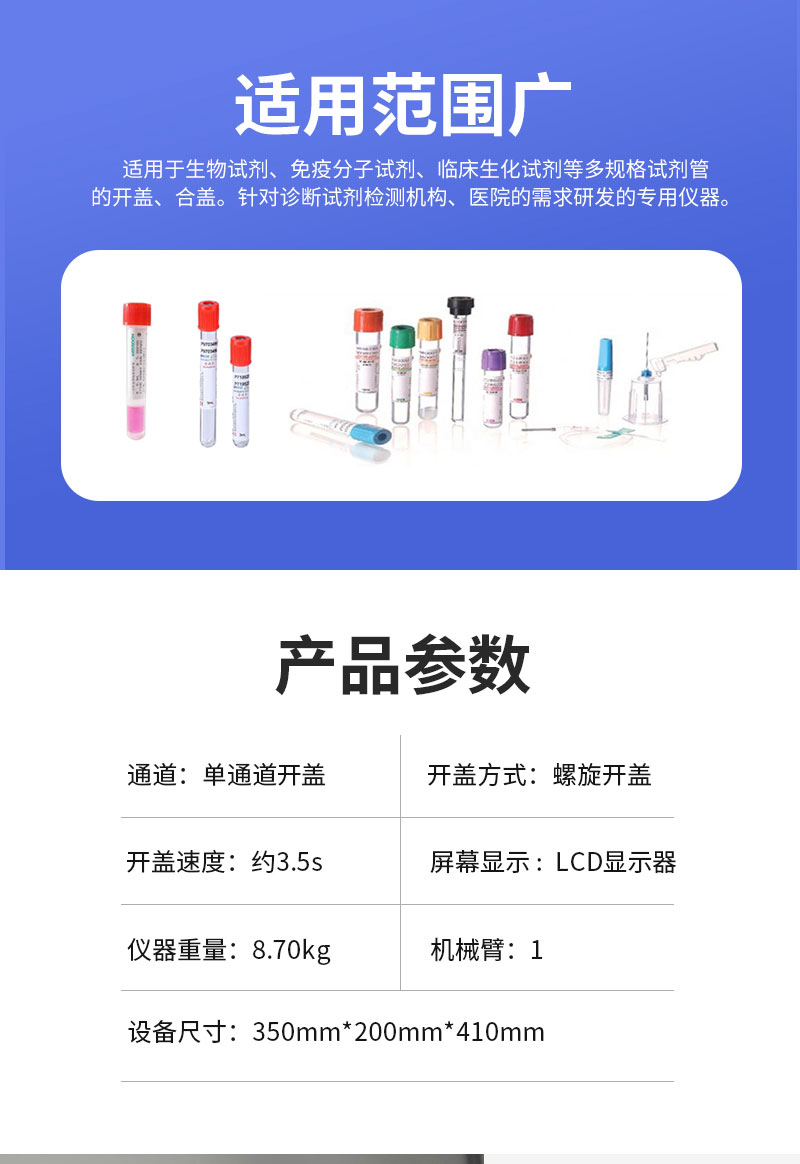 主要針對采樣管及樣品管的開蓋、關蓋功能,采用紅外感應實時判斷采樣管位置同時并發(fā)出開蓋、關蓋指令,自動識別夾緊管蓋,完成開關蓋動作,開蓋、關蓋只需3~3.5秒鐘。廣泛應用于病毒采樣管開關蓋工作。適用于各