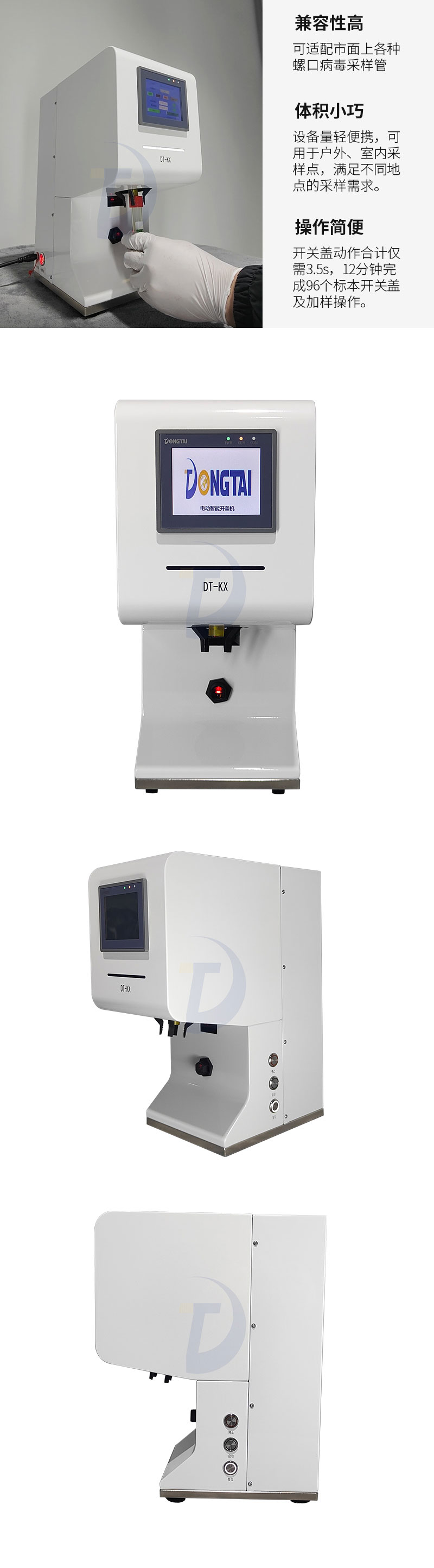 主要針對采樣管及樣品管的開蓋、關蓋功能,采用紅外感應實時判斷采樣管位置同時并發(fā)出開蓋、關蓋指令,自動識別夾緊管蓋,完成開關蓋動作,開蓋、關蓋只需3~3.5秒鐘。廣泛應用于病毒采樣管開關蓋工作。適用于各類醫(yī)療、積控、醫(yī)院、科研、檢測、實驗室、戶外或室內采樣點。