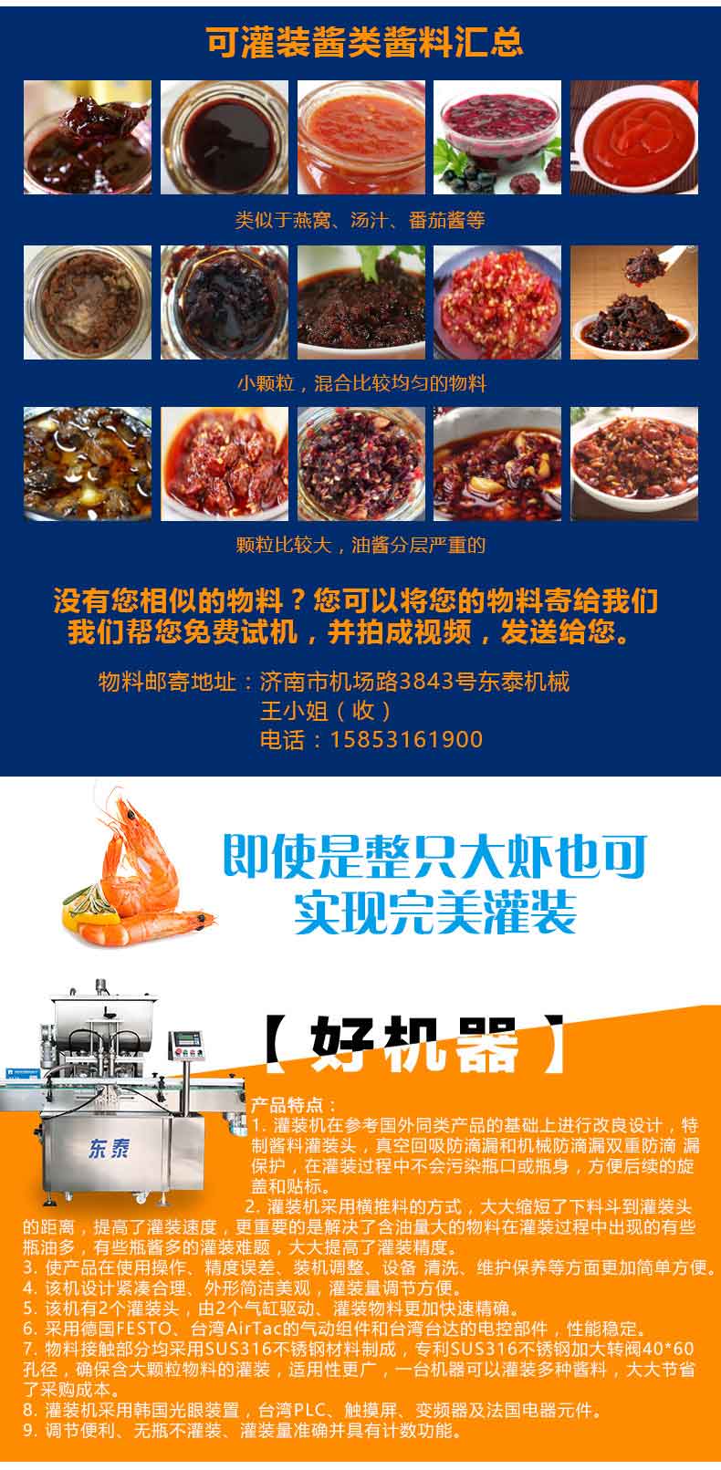 山東東泰機(jī)械制造有限公司是小包裝油類包裝線、軟包裝油類灌裝機(jī)、溶液灌裝機(jī)、填充機(jī)及后段包裝設(shè)備、工業(yè)機(jī)器人等產(chǎn)品專業(yè)生產(chǎn)加工的公司,擁有完整、科學(xué)的質(zhì)量管理體系。 山東東泰機(jī)械制造有限公司的誠信、實(shí)力和產(chǎn)品質(zhì)量獲得業(yè)界的認(rèn)可。 歡迎各界朋友蒞臨參觀、指導(dǎo)和業(yè)務(wù)洽談。