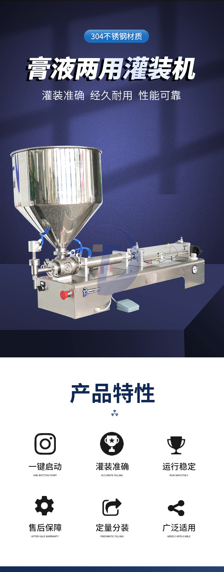 1.該膏液灌裝機為全氣動控制機型,該膏體灌裝機缸體、機殼、料斗均由不銹鋼材料制成。