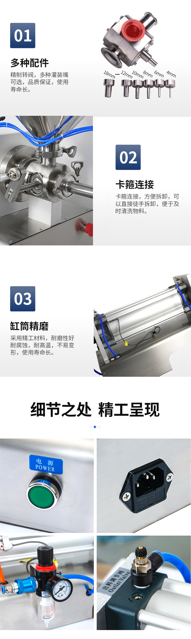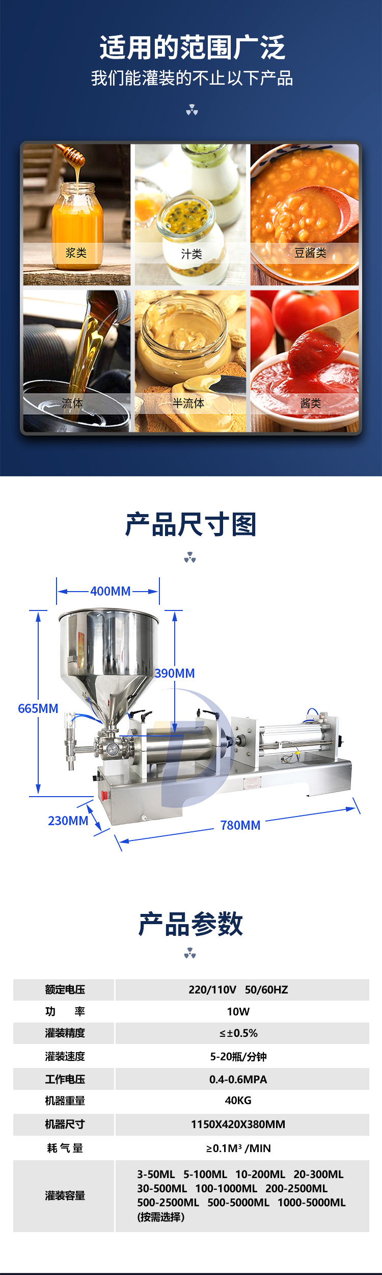 2.該膏液灌裝機采用氣動控制,并采用硬定位,所以灌裝精度高,精度可以控制在0.5%以內(nèi)(以大灌裝量為標準)