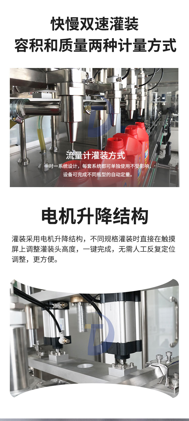全自動潤滑油灌裝主機采用流量計的灌裝方式,一對一系統(tǒng)設(shè)計,4頭灌裝機采用4套供料系統(tǒng)單灌裝主機采用流量計的灌裝方式,一對一系統(tǒng)設(shè)計,每套系統(tǒng)都可單獨使用不受影響,設(shè)備可完成不同瓶型的自動定量;灌裝頭自帶回吸功能,防止油品外溢,灌裝機頂部帶有儲料箱,儲料箱內(nèi)部免存料設(shè)計,儲料箱內(nèi)要有高、低液位裝置,高、低液位信號要求是24V、4~20mA,由接線端子輸出。