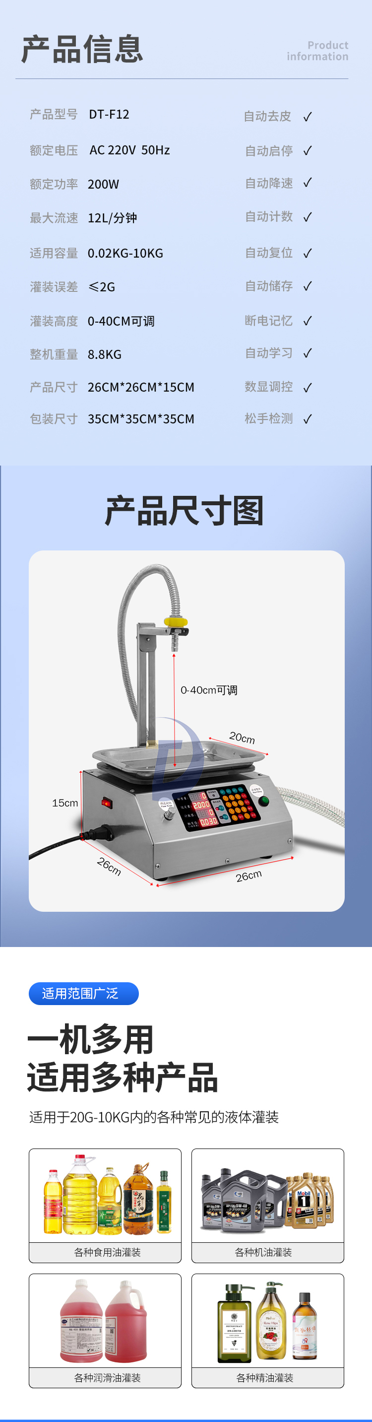 稱重式智能灌裝機 一機多用 適用多種產(chǎn)品 適用于30g-15KG內(nèi)的各種常見液體灌裝,例如:各種食用油、玻璃水、洗衣液、醬油醋、各種飲料等。