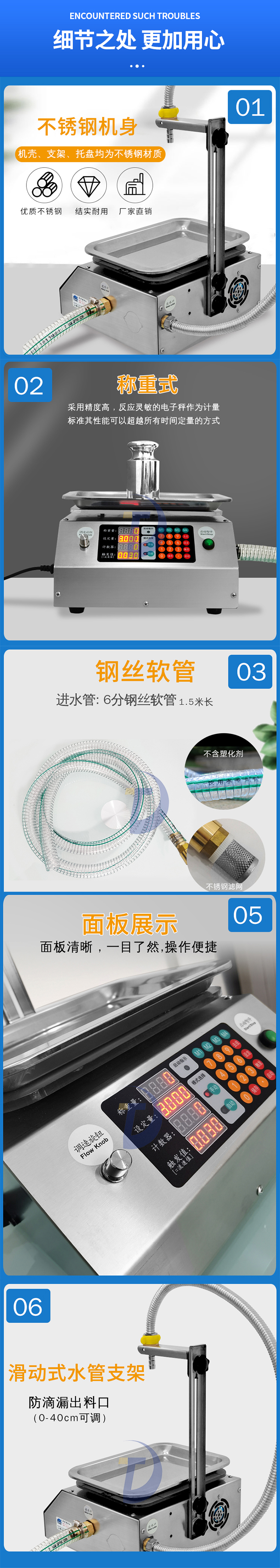 采用反應靈敏的電子秤作為計量準確,滑動式水管支架,防滴漏出料口。0-40cm可調(diào),符合生產(chǎn)加工需求。