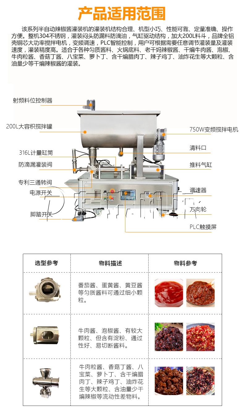 辣椒醬是我們?nèi)粘I钪胁豢扇鄙俚囊徊糠,受到了廣大群眾的喜愛。談起辣椒醬,我們就會(huì)想到辣椒醬灌裝機(jī),東泰機(jī)械自主研發(fā)了一款半自動(dòng)辣椒醬灌裝機(jī)。半自動(dòng)辣椒醬灌裝機(jī)是醬類灌裝機(jī)中必不可少的一款設(shè)備,該半自動(dòng)辣椒醬灌裝機(jī)的缸體、機(jī)殼、料斗均由不銹鋼材料制成,活塞由聚四氟乙烯材料制成,氣動(dòng)部分均采用進(jìn)口氣動(dòng)元件,符合GMP要求。半自動(dòng)辣椒醬灌裝機(jī)灌裝量和灌裝速度均可任意調(diào)節(jié),精度高,結(jié)構(gòu)簡(jiǎn)潔,操作便利。該半自動(dòng)辣椒醬灌裝機(jī)適用于調(diào)味品中帶顆粒并且濃度較大的牛肉醬、辣椒醬、豆瓣醬、花生醬、芝麻醬、果醬、牛油火鍋底料、紅油火鍋底料等物質(zhì)的粘稠醬類的灌裝。